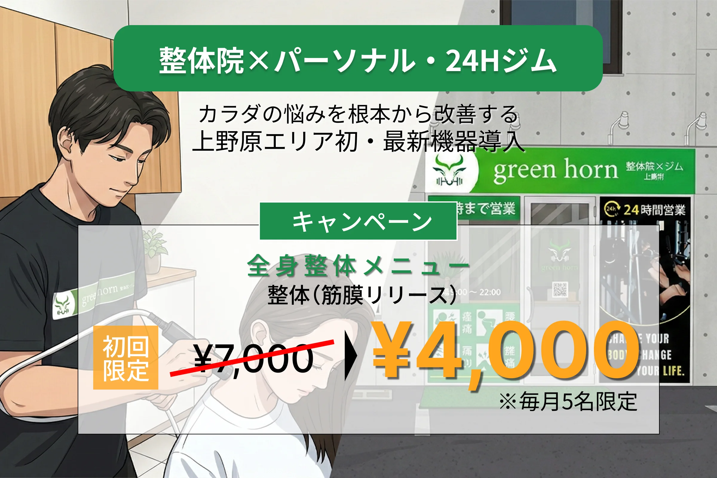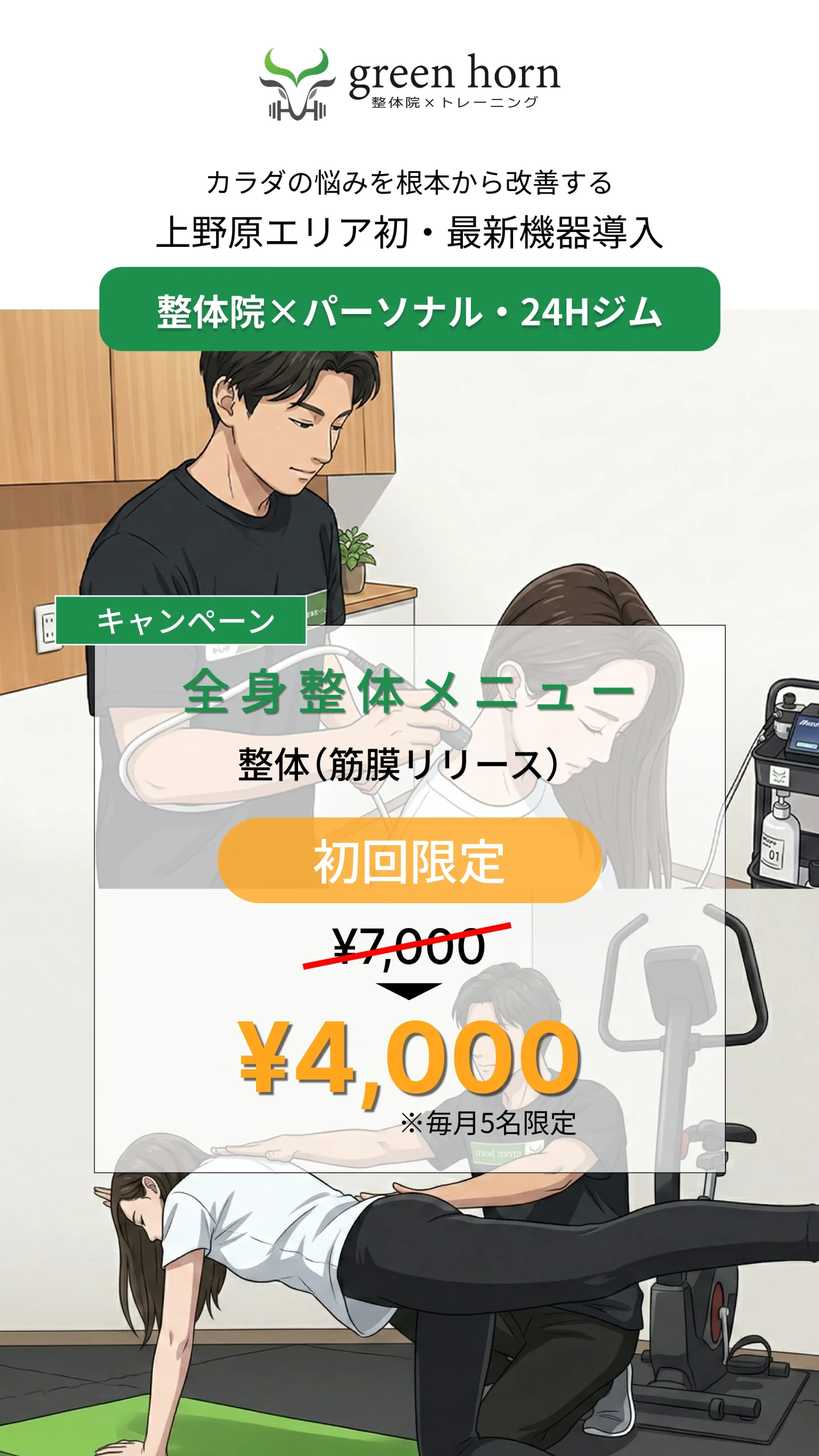 体の痛み、歪み、肥満や健康状態に不安があるかたのためにgreen horn(グリーンホーン)は整体から筋力トレーニングまで、最新の医療機器と共に施術を行っています。